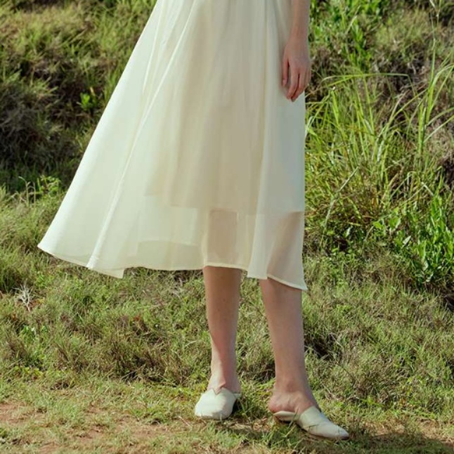 フレアシルエットが風を含み、動くたびに美しく揺れる姿が魅力的。