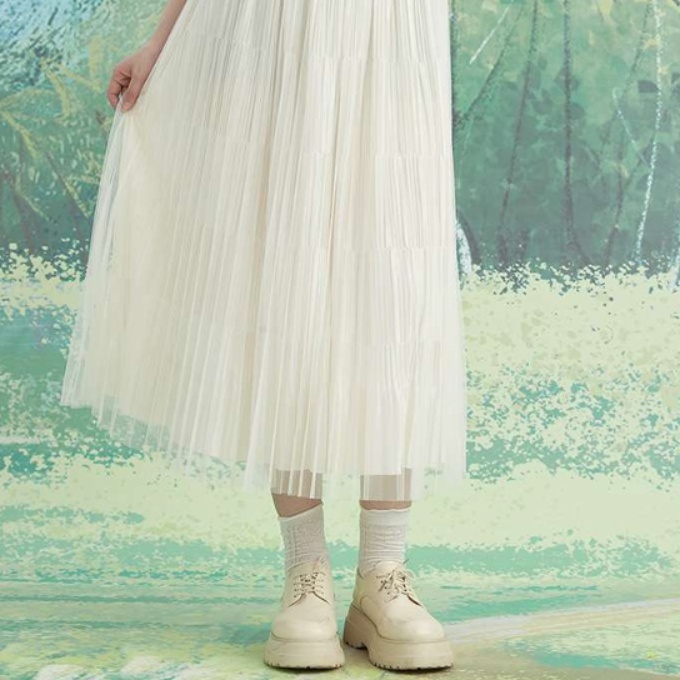 しなやかなチュールで仕立てられたプリーツスカートは、上品な揺れ感が特徴。軽やかな印象を与えつつ、エレガントさも兼ね備えたデザインは、特別な日にもぴったり。優雅に舞うプリーツが動くたびに美しいシルエットを描き、どんなコーディネートにも華やかさをプラスします。大人の女性にふさわしいスタイルを楽しんで。