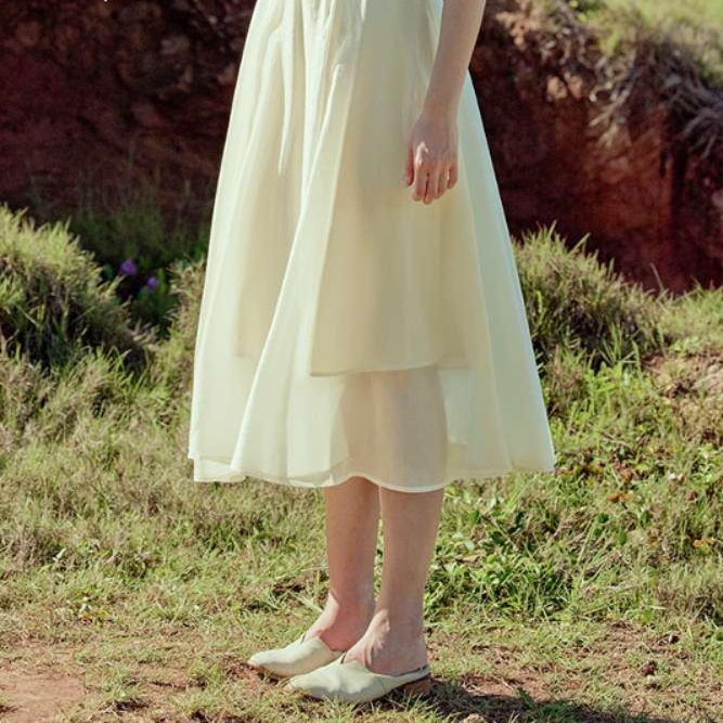 裾に向かって広がる繊細なドレープが、動きに合わせて自然な揺れ感を演出します。