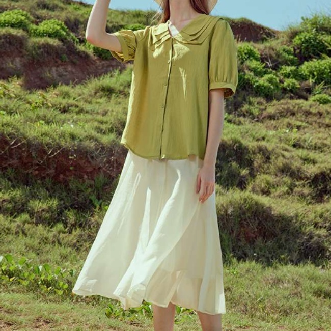 通気性の良い生地構成で、快適な着用感とともに上品な透け感が春夏らしい雰囲気を醸し出します。